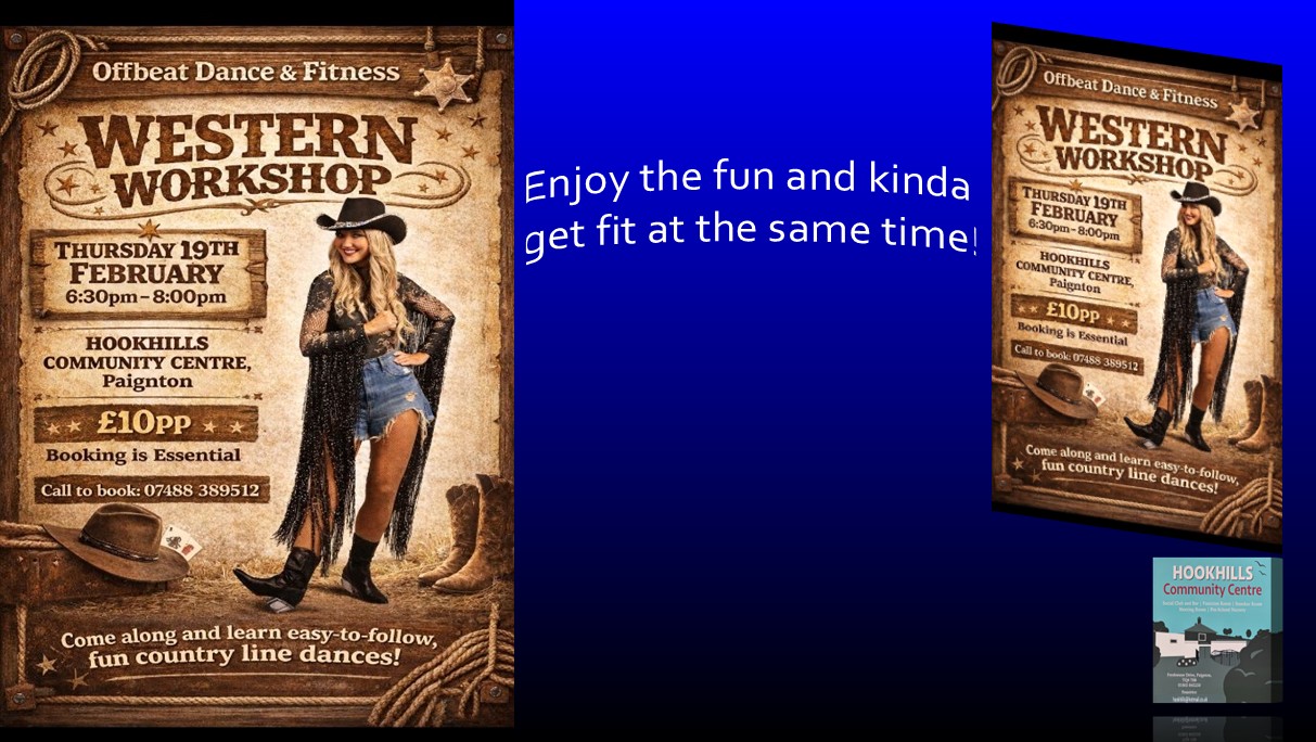 Western Workshop are doing an evening here at the Hookhills Community Centre 6.30pm – 8.00pm. Join us for a good old fashioned hoedown as we take you through easy to follow line dances. Suitable for all abilities. £10 per person. Please call to book: 07488 389512.